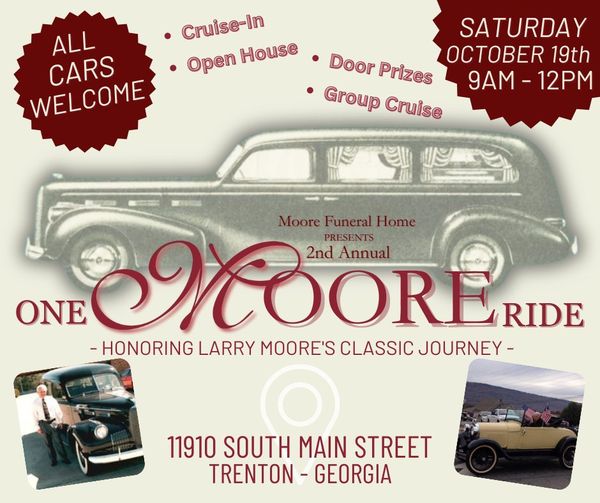 Mark your calendars! On October 19, 2024, we’re excited to host the 2nd Annual One Moore Ride Cruise-In at Moore Funeral Home. Bring your ride for a morning filled with fun, community, and amazing automobiles.