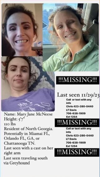 They are asking for the public’s help in locating Mary Jane McNeese, who was last seen in Dade County. Mary Jane McNeese was last seen getting on a gray hound bus in Wildwood in Dade County GA. If you know the whereabouts of Mary Jane please call your local Law Enforcement.