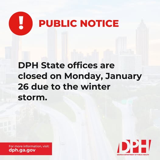 The Georgia Department of Public Health Northwest Health District announced that its district office in Rome, along with county health departments across northwest Georgia, will be closed on Monday, January 26, due to anticipated hazardous weather conditions.