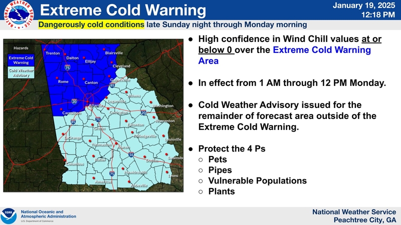 An Extreme Cold Warning is in place for much of North Georgia tonight into Monday morning. Wind chill values will reach 0 or below in the area. A Cold Weather Advisory has been issued for the rest of the forecast area, where wind chills will be in the single digits.