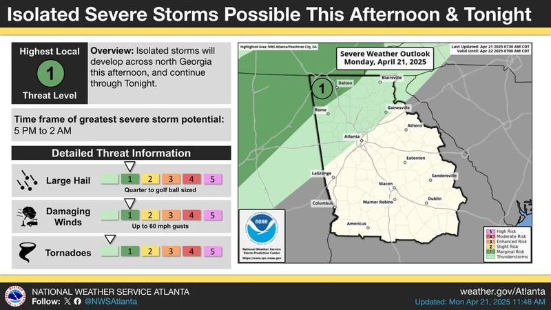 A frontal boundary will slide into NW GA later and stay fairly stationary across the area through Tuesday. We will see some showers and thunderstorms with the possibility of an isolated severe storm or two. Gusty winds and hail will be the biggest threat with any strong storms.