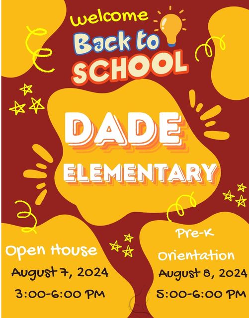 Open house at Dade Elementary School – August 7, 2024 from 3p-6p. Pre-K Orientation will be August 8, 2024 from 5p – 6p. Dade Elementary is located at 306 Wolverine Drive, Trenton, GA. Make sure to stop by and meet the teachers and administration.