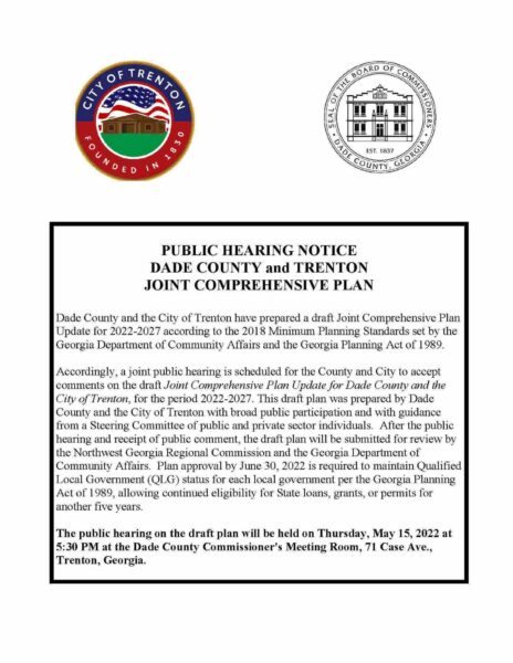 Accordingly, a joint public hearing is scheduled for the County and City to accept comments on the draft Joint Comprehensive Plan Update for Dade County and the City of Trenton, for the period 2022-2027. This draft plan was prepared by Dade County and the City of Trenton with broad public participation and with guidance from a Steering Committee of public and private sector individuals.  After the public hearing and receipt of public comment, the draft plan will be submitted for review by the Northwest Georgia Regional Commission and the Georgia Department of Community Affairs.  Plan approval by June 30, 2022 is required to maintain Qualified Local Government (QLG) status for each local government per the Georgia Planning Act of 1989, allowing continued eligibility for State loans, grants, or permits for another five years.