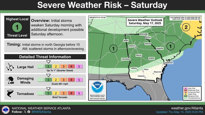 According to forecasters, a line of strong to severe storms is expected to move into far northwest Georgia after midnight Friday, potentially impacting Dade County in the early morning hours of Saturday. While this initial round is likely to weaken as it moves eastward, residents are advised to stay alert.