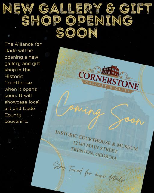 The Alliance for Dade will be opening a new gallery and gift shop in the Historic Courthouse when the renovations are completed. It will be Cornerstone Gallery & Gift Shop and it will showcase local art and Dade County souvenirs. The Historic Courthouse and Museum is located at 12345 Main Street, Trenton, GA.