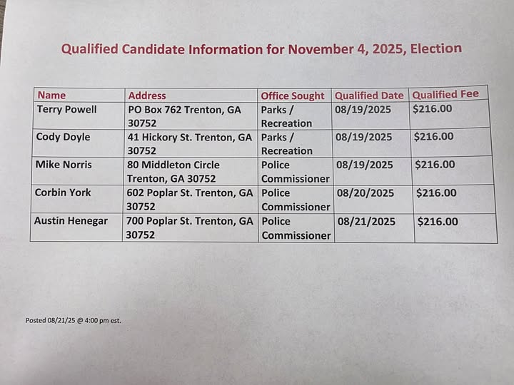 The City of Trenton qualifying for the November 4th election has ended today at 4pm Thursday Aug 21 with the candidates listed below.