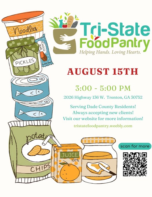 The Tri-State Food Pantry will host its next food distribution on Friday, August 15th, from 3:00 to 5:00 PM at 2026 Highway 136 W, Trenton, GA 30752.