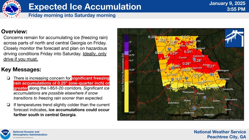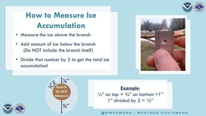 According to the NWS a forecast for 0.10 (one-tenth) inch to 0.25 (one-quarter) inch of freezing rain may not sound like much, but here’s why a light coating of ice can be crippling. Just a glaze of ice can make travel dangerous, as vehicle tires easily lose traction. Additionally, the extra weight (and ice is deceptively heavy!) on power lines and tree limbs can lead to power outages.